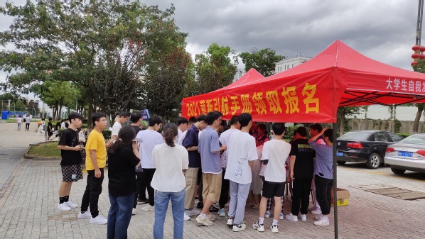 新生报到后首日中午,学校食堂门口搭起了帐篷,排起了长队,2021级新生们正在争相领取《2021级萌新引航手册》。