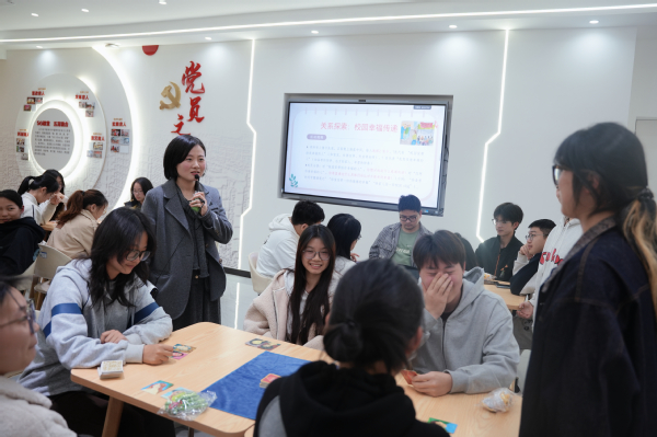 3月18日下午,“心卡时光・解锁大学幸福密码”OH卡团辅活动在党群服务中心率先开启,24名来自不同学院的同学齐聚一堂,在心理中心董佳妮老师的带领下开启一场内心探索之旅。活动伊始,老师为同学们讲解OH卡的使用理念,明确其是内心声音的投射而非占卜,让大家放下顾虑、轻松参与。从破冰行动、找共同点的小组互动,到故事接龙、幸福溯源的卡牌解读,再到关系探索、幸福传递的心声分享,同学们在趣味互动中快速拉近距离,将抽到的卡牌与生活中的点滴幸福相连,在轮流解读与真诚交流中梳理成长困惑、发掘自身潜能。两小时的团辅活动里,没有标准答案与对错评判,只有温柔的倾听与真诚的分享,同学们在向内探寻中提升了自我认知与情绪调节能力,真正解锁了属于自己的大学幸福密码。